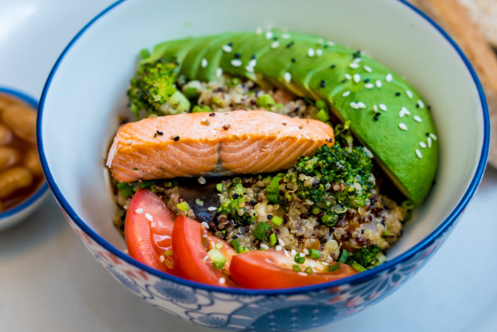 Mittagessen: Lachs-Bowl mit Quinoa & Avocado